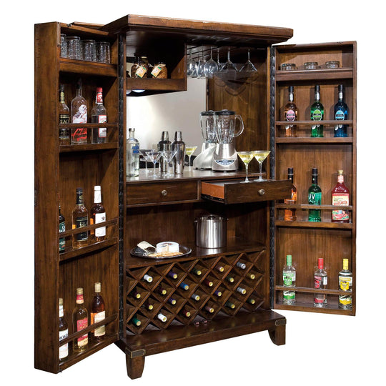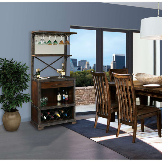 This handsome wine cabinet features a Rustic Hardwood finish on select hardwoods and veneers, burnished brass metal accents, and a burnished bronze bar pull. A metal stemware rack holds 15 large wine glasses. Features a decorative...Sale price $1,649.00Regular price $2,126.00Sale price $1,649.00Regular price $2,126.00 -