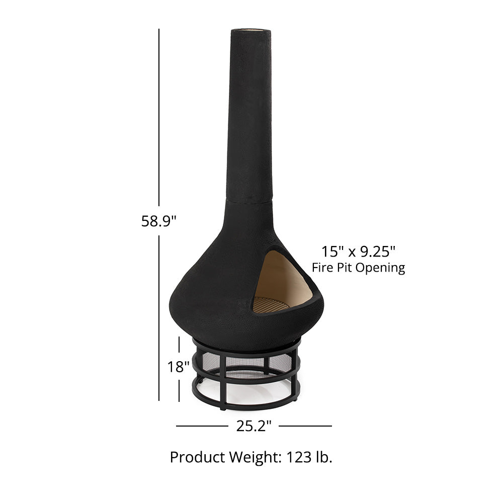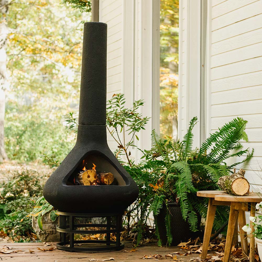 Add rustic charm and cozy warmth to your outdoor space with this modern ceramic chiminea. Made to burn wood and coal, this stylish outdoor fireplace is the perfect gathering centerpiece. The ceramic chimney channels heat and smoke upward and away, making it great for guests sensitive to smoke. Its semi-enclosed firebox has a wide opening for easy loading of wood or charcoal onto the included elevated fire grate. The heat-resistant stand raises the chiminea to chair height, creating an inviting view of the fire. Built to last, it’s stable on any flat surface, so you won’t have to worry about tipping.
