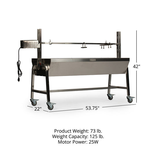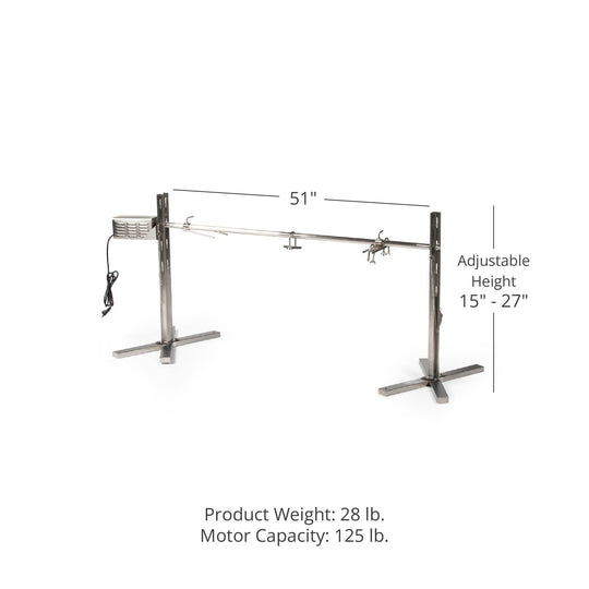 This rotisserie spins in smooth, even rotations at 4 RPM for evenly cooked meats every time. Choose between a 25-Watt motor for large game up to 125 LB or a 13-Watt motor for medium game up...Sale price From $294.97Regular price $490.00Sale price From $294.97Regular price $490.00 -
