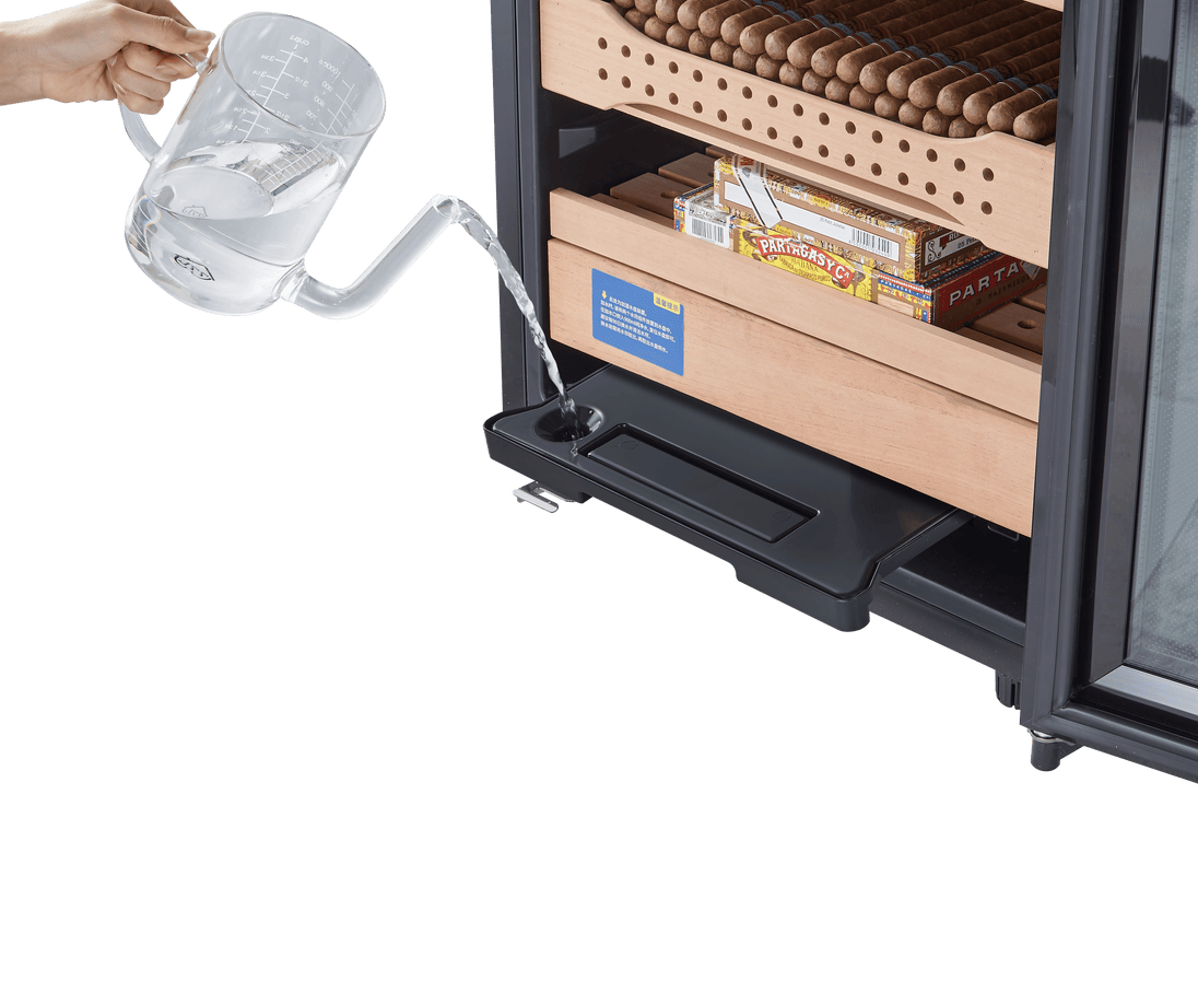 Afidano 850 Count cigar humidor is made of Spanish cedar and the low- E glass door is equipped with an original HPR temperature and humidity constant system to give your cigar a relaxed and comfortable space for fermentation. At the same time, Afidano cigar humidors can be controlled by our APP. It is also equipped with a fingerprint lock to protect the cigars.