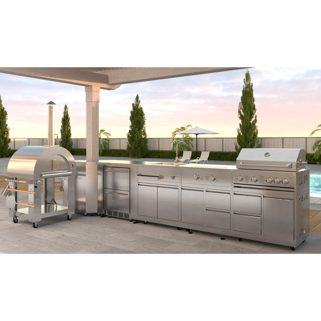 KoolMore Outdoor Kitchen Series Modular Kitchen with a Wood fire Pizza Oven, Refrigerator Cabinet, Double Refrigerator Drawers, Sink and a 30 in. BBQ Grill and Cabinet in Stainless-Steel (KM-OKSKIT-CONFIG100)