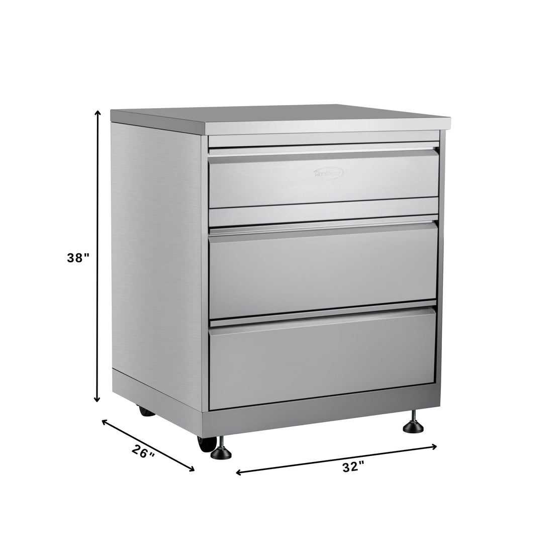 AN additional cabinet with 3 drawers offers even more storage for all your outdoor kitchen needs.
