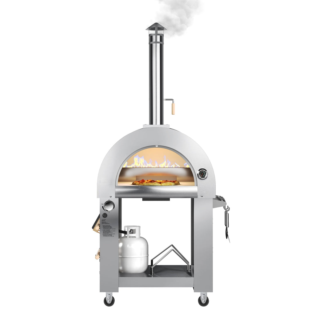 Enjoy wood-fired or gas-powered pizzas with the dual-fuel pizza oven, complete with essential tools and easy mobility on locking casters.