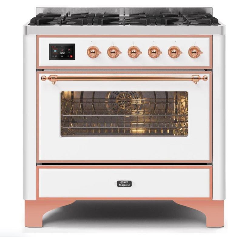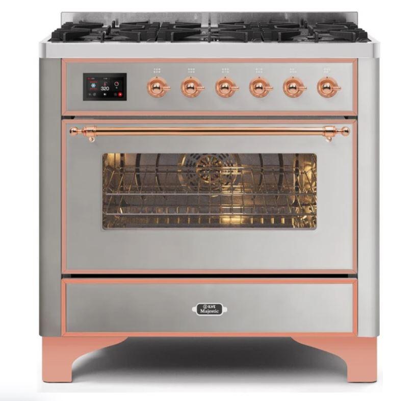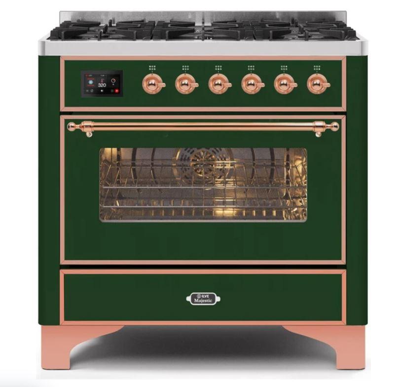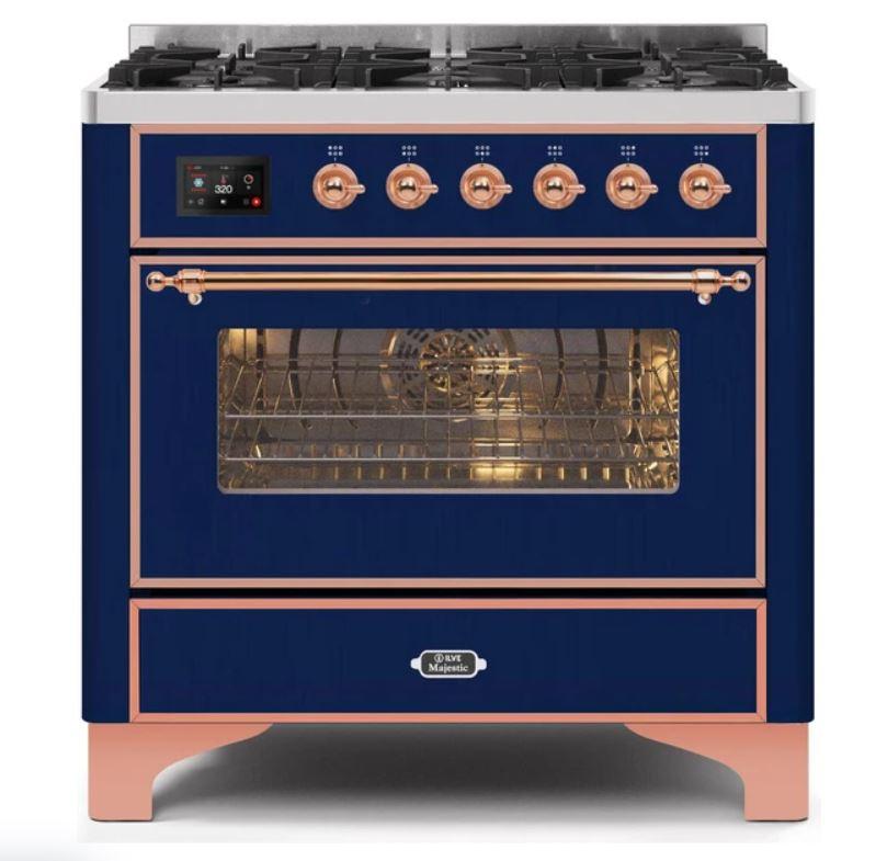Elevate your kitchen with theILVE Majestic II 36" Dual Fuel Range, wheretimeless Italian designmeetsrestaurant-quality power. Featuring6 brass burners(including a powerful20,000 BTU wok burner), a3.5 cu. ft. convection oven, andpremium stainless steel construction, this range delivers exceptional performance for serious home chefs.