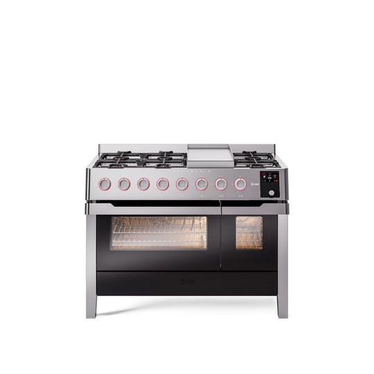 ILVE 48" Panoramagic Series Freestanding Double Oven Dual Fuel Range with 8 Sealed Burners and Griddle - UPM12FDS3SS