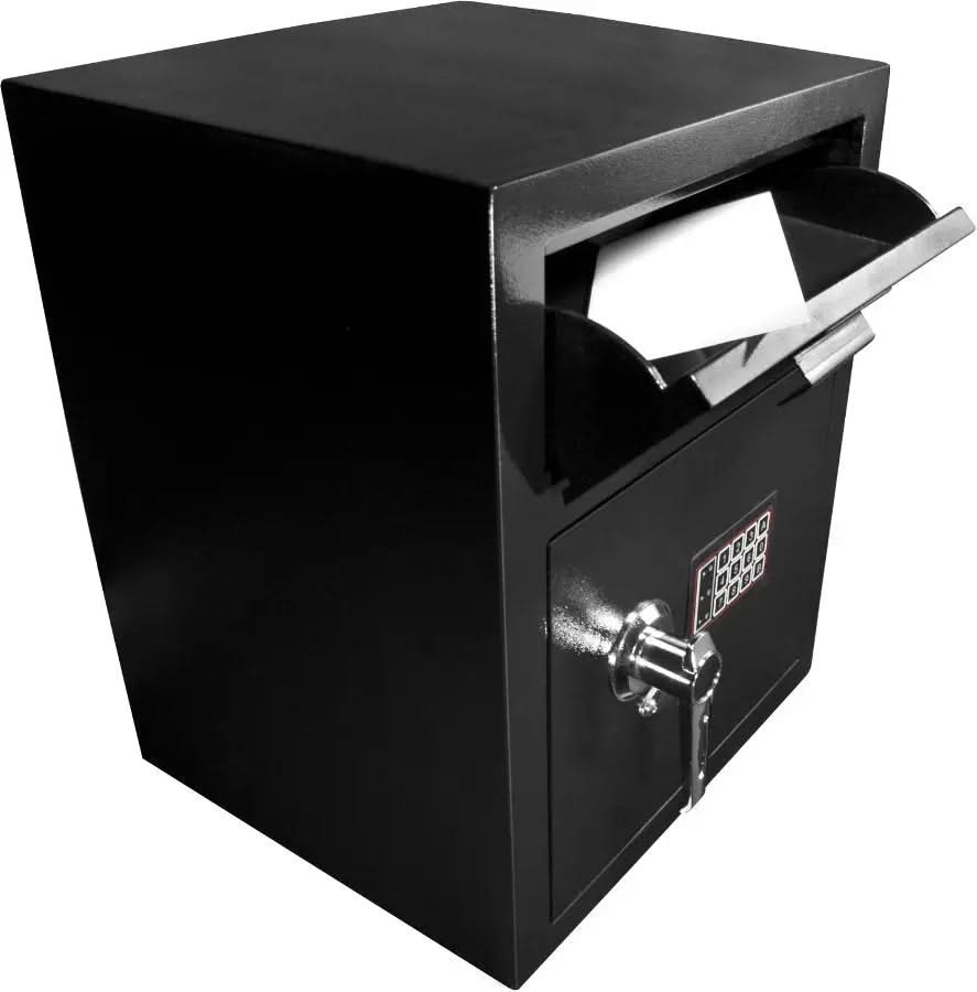 - The drop door fits cash, checks, keys, small envelopes, and most cash bags
