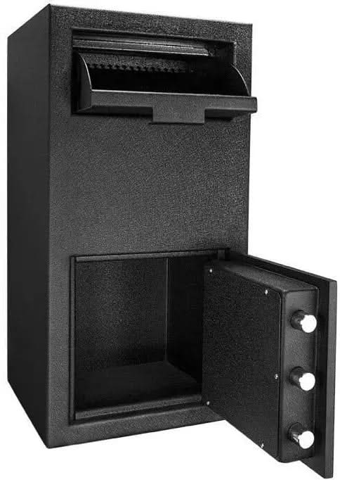 The safe features a front-loading drop drawer with a line of serrated teeth, which serves to prevent deposited items from being retrieved through the drop drawer.
