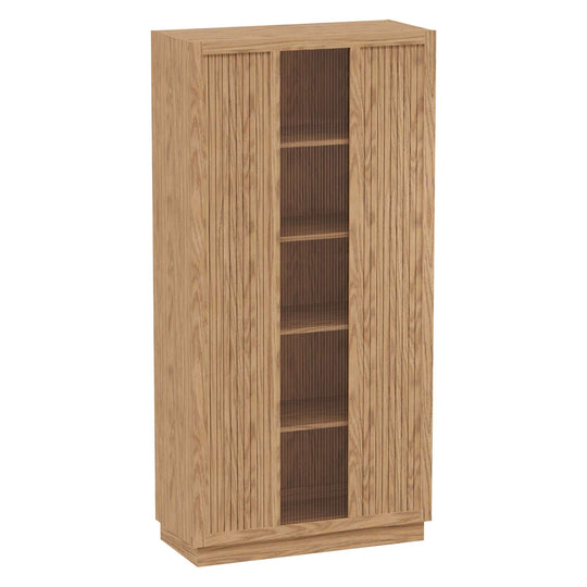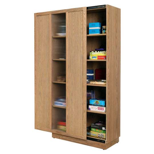 Light Oak with matching finished shelves. Made from select solids and veneers. Three adjustable and one fixed composite shelves. Sliding door with center inset reeded glass and outer tambour appearance. Floor levelers.Sale price $2,599.00Regular price $3,337.00Sale price $2,599.00Regular price $3,337.00 -