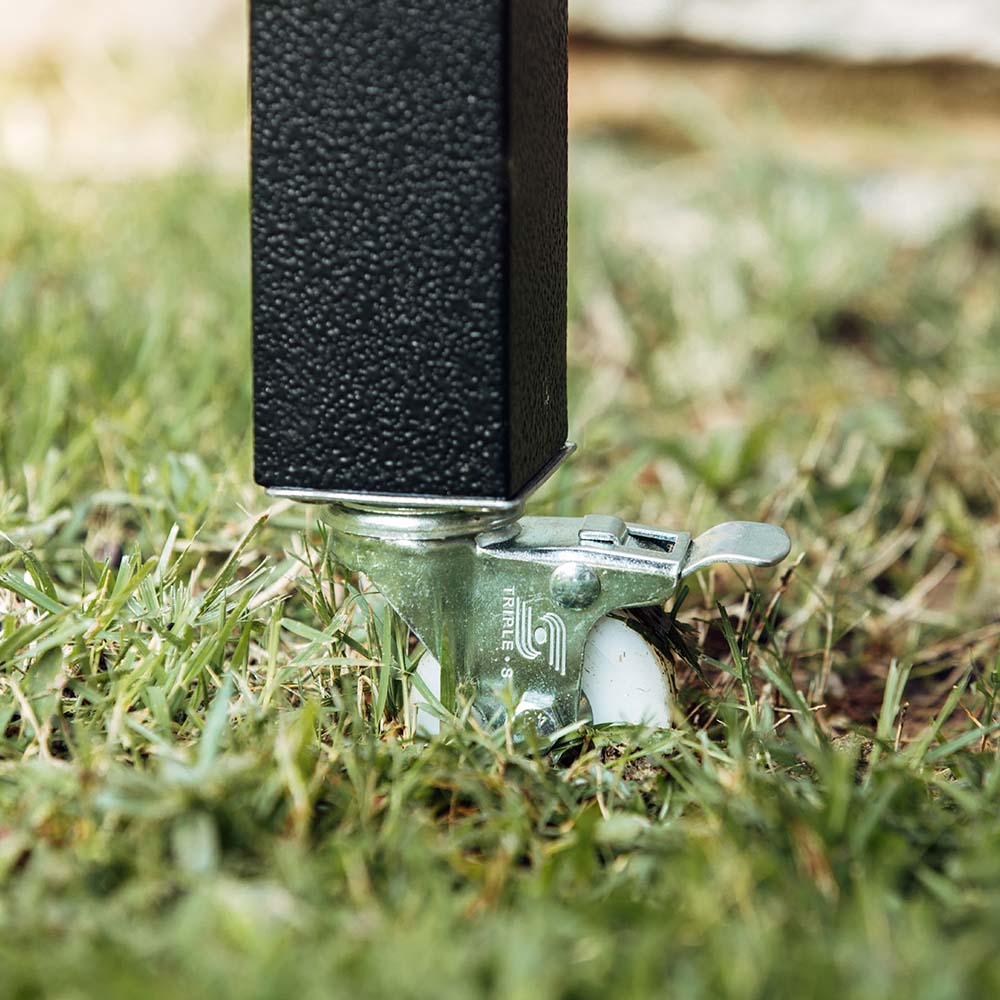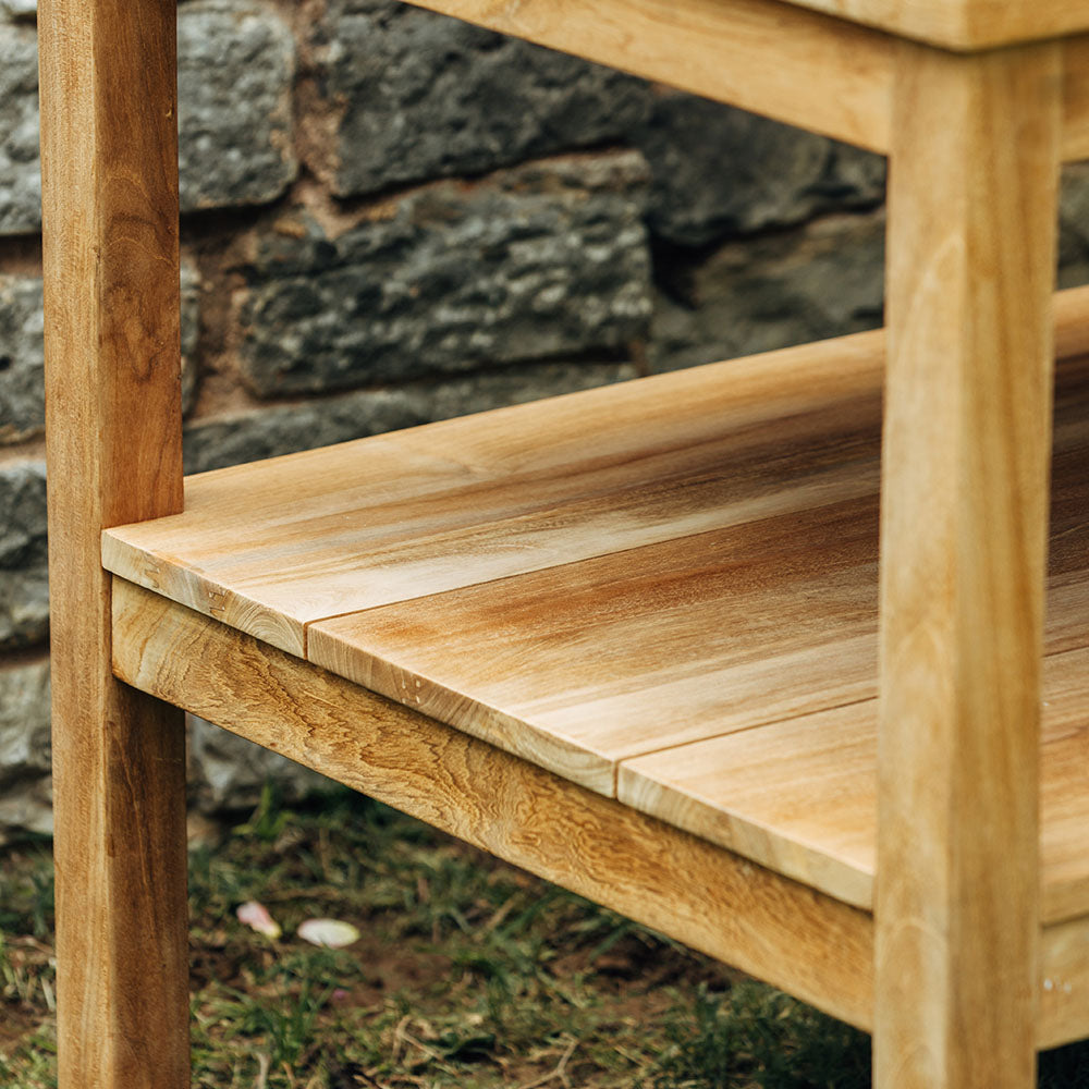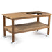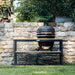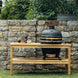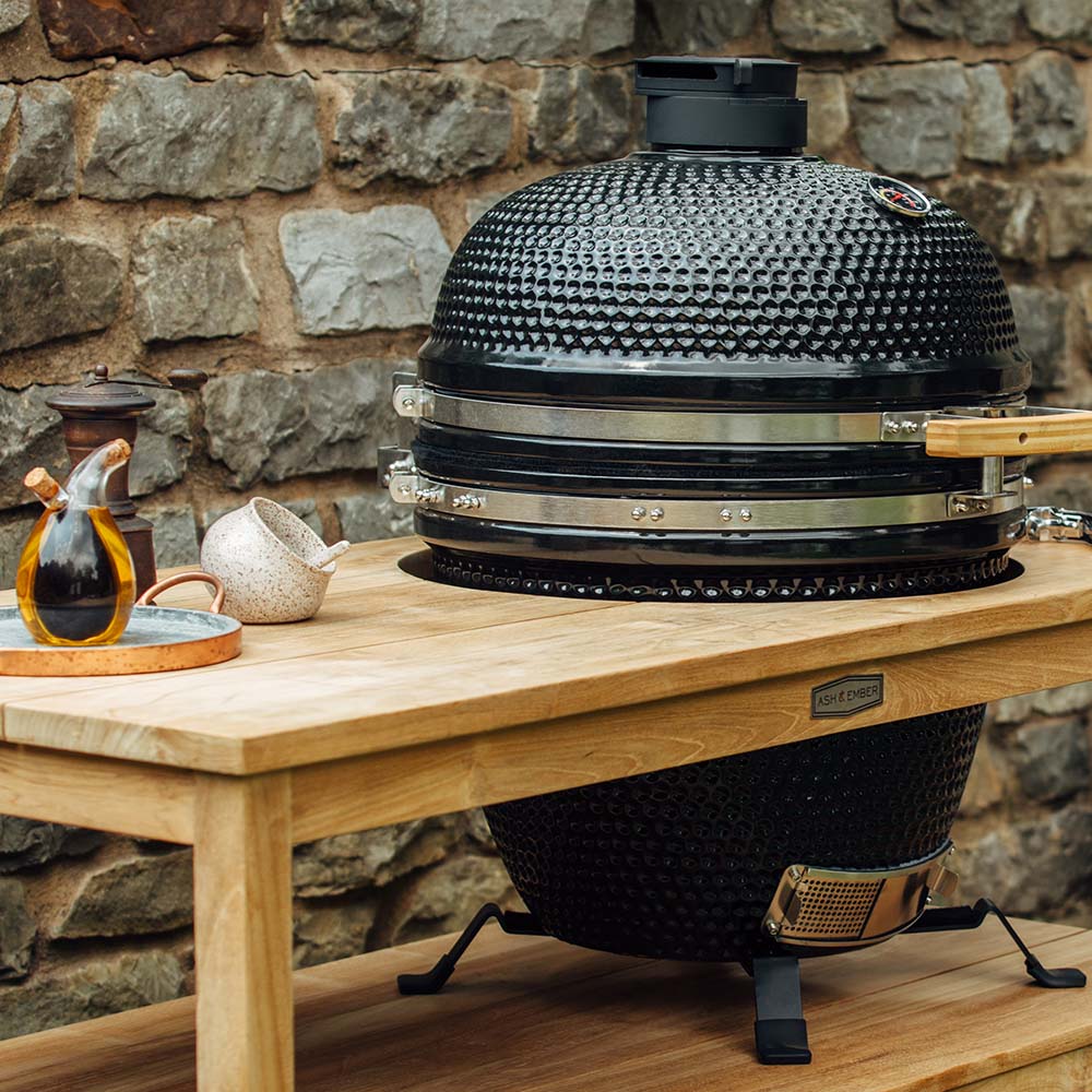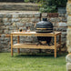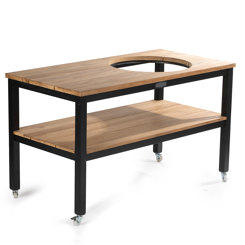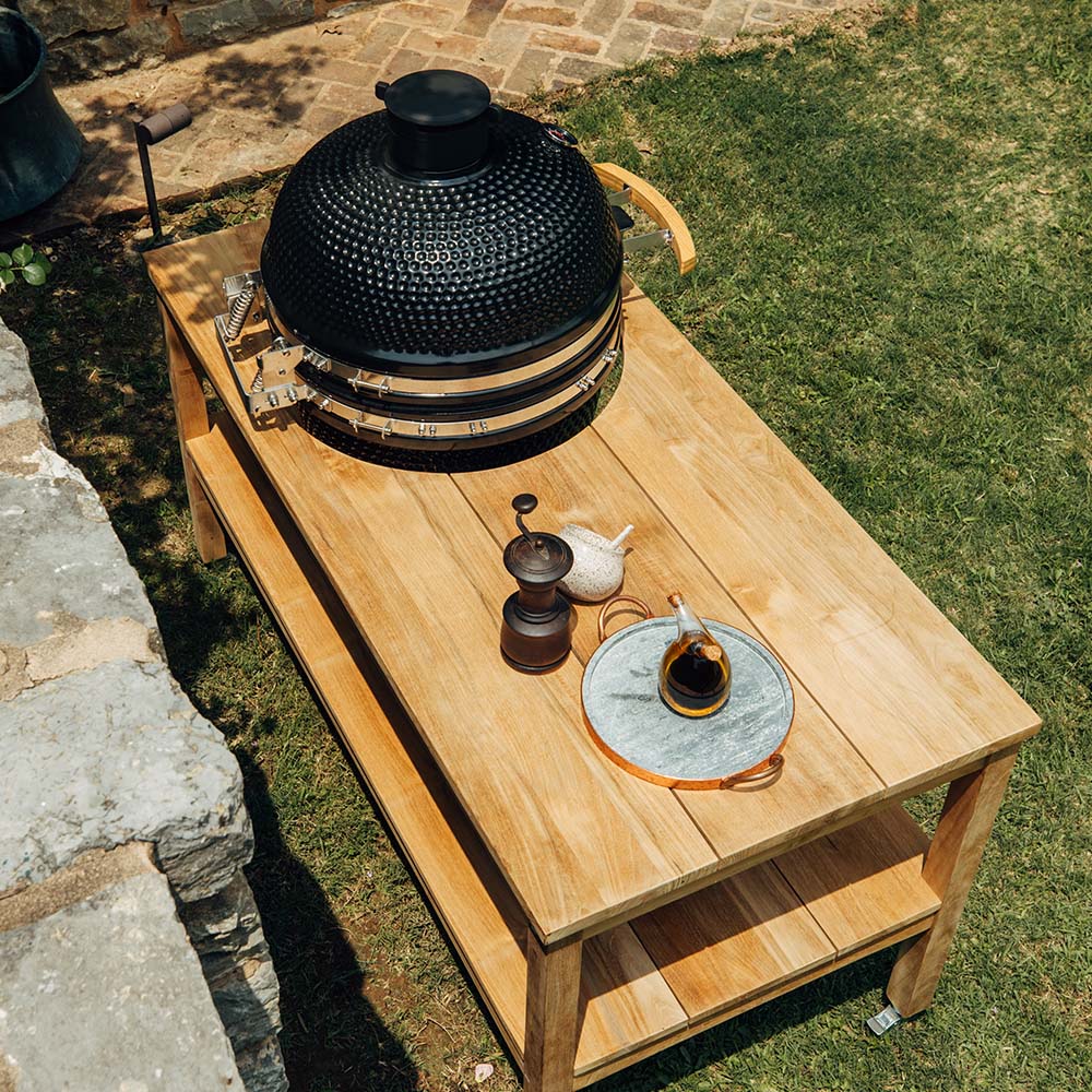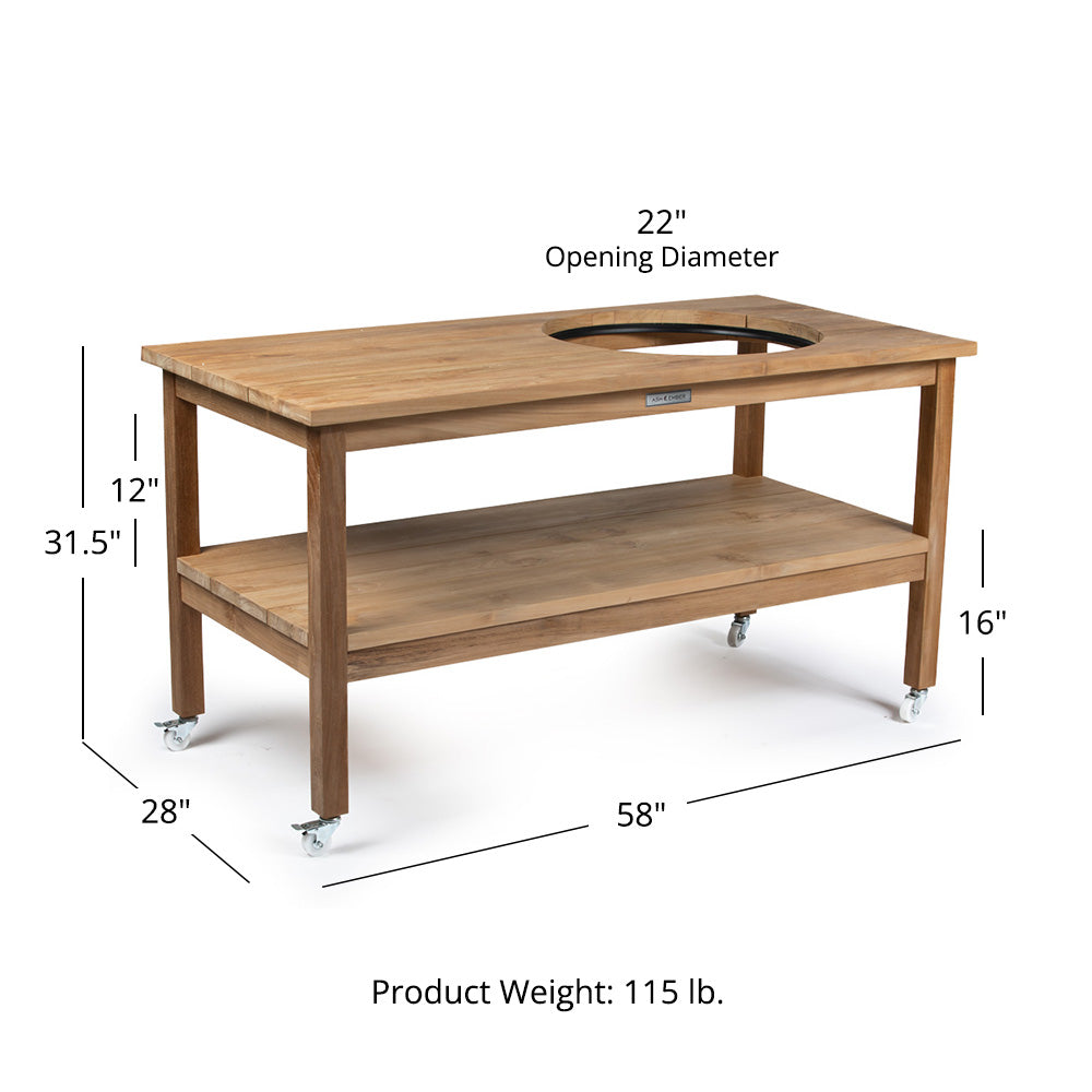 This outdoor grill table is compatible with most popular ceramic grills, including XL BGE, Kamado Joe, and Ash & Ember and features a 22" diameter opening. Made with Grade A Teak wood, this all-weather outdoor grill cart is crafted with naturally weather-resistant premium teak wood. Two large shelves provide ample space to store charcoal and wood, prep food, and keep supplies on hand. With four castor wheels and a locking mechanism, this portable grill table is easy to move from one spot to another but locks in place for maximum stability.
