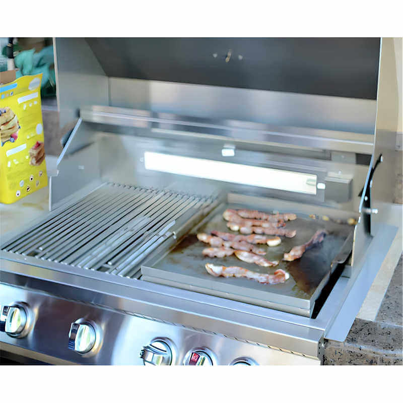 The ceramic briquette flame tamer system ensures even heat distribution while reducing flare-ups and protecting the burners from grease. Combined with a dual-walled grill hood, it helps maintain steady internal temperatures and prevents heat distortion for reliable performance.