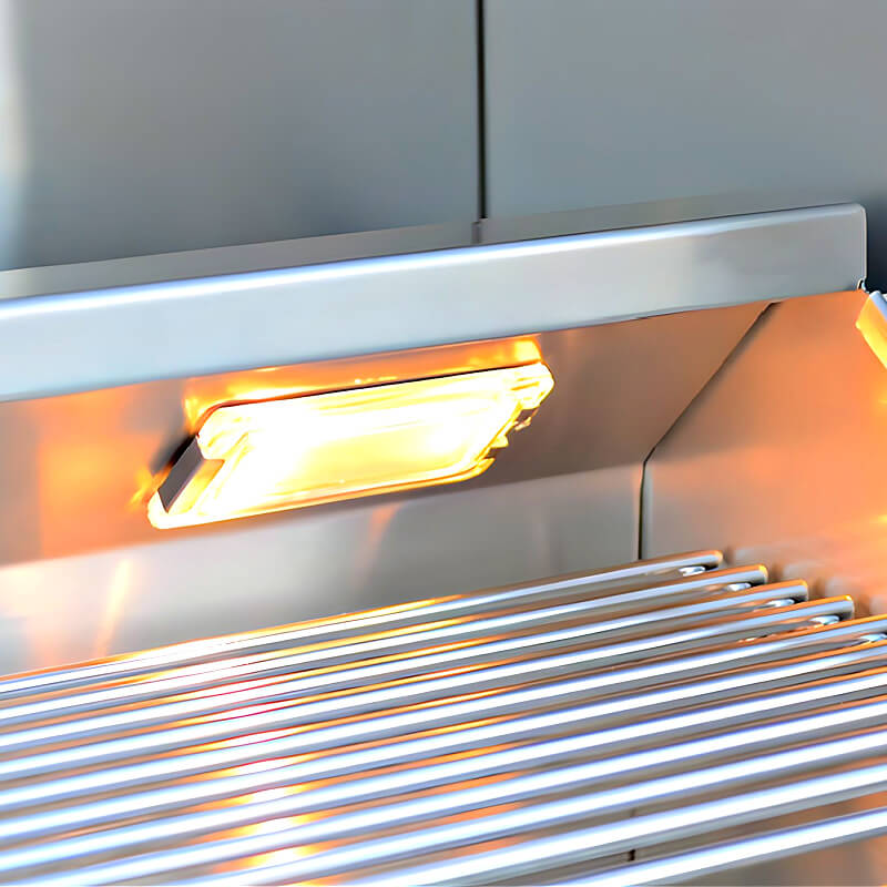 For enhanced visibility and usability, the grill includes dual halogen interior lights for nighttime cooking and red LED-illuminated control knobs for improved visibility and a professional aesthetic.