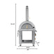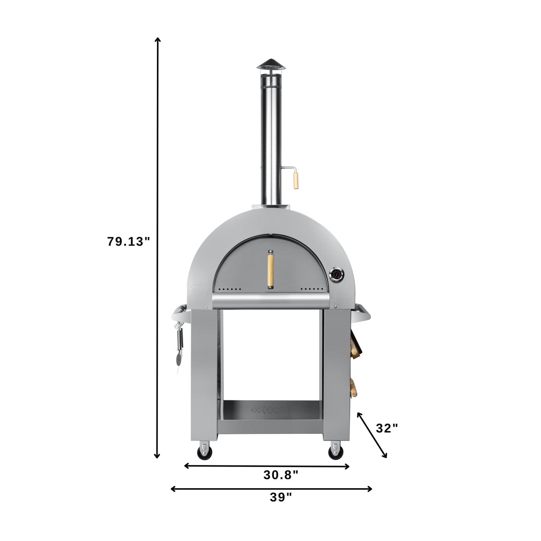 Enjoy wood-fired or gas-powered pizzas with the dual-fuel pizza oven, complete with essential tools and easy mobility on locking casters.