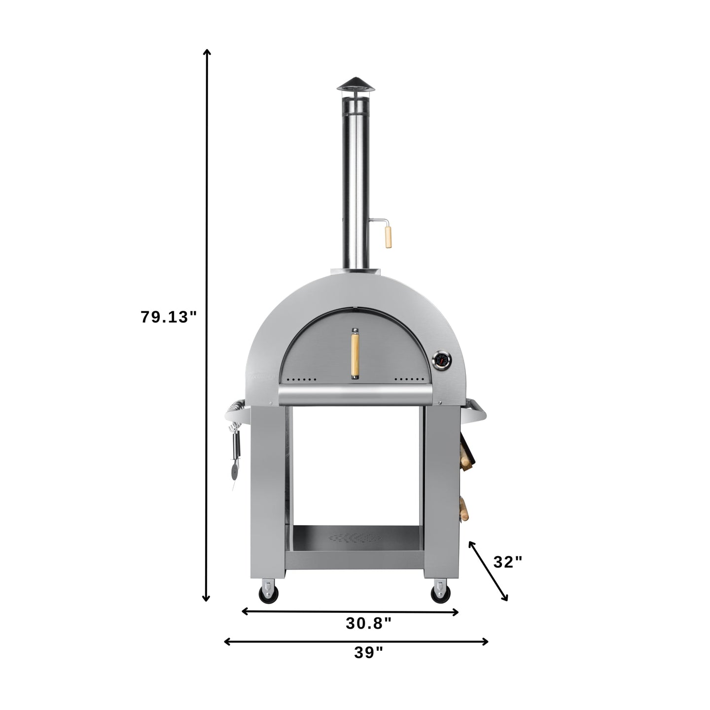Enjoy wood-fired pizzas with the pizza oven, complete with essential tools and easy mobility on locking casters.