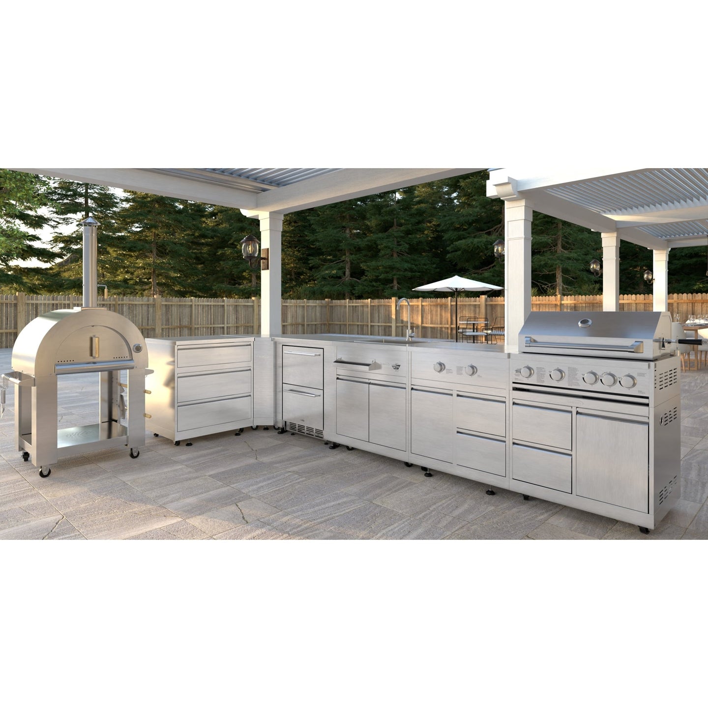 KoolMore Outdoor Kitchen Series Modular Kitchen with a Woodfire Pizza Oven, 3 Drawer Cabinet, Corner Cabinet, Double Refrigerator Drawers with a Cabinet, Sink, Side Burner and a 30 in. BBQ Grill and Cabinet in Stainless-Steel.